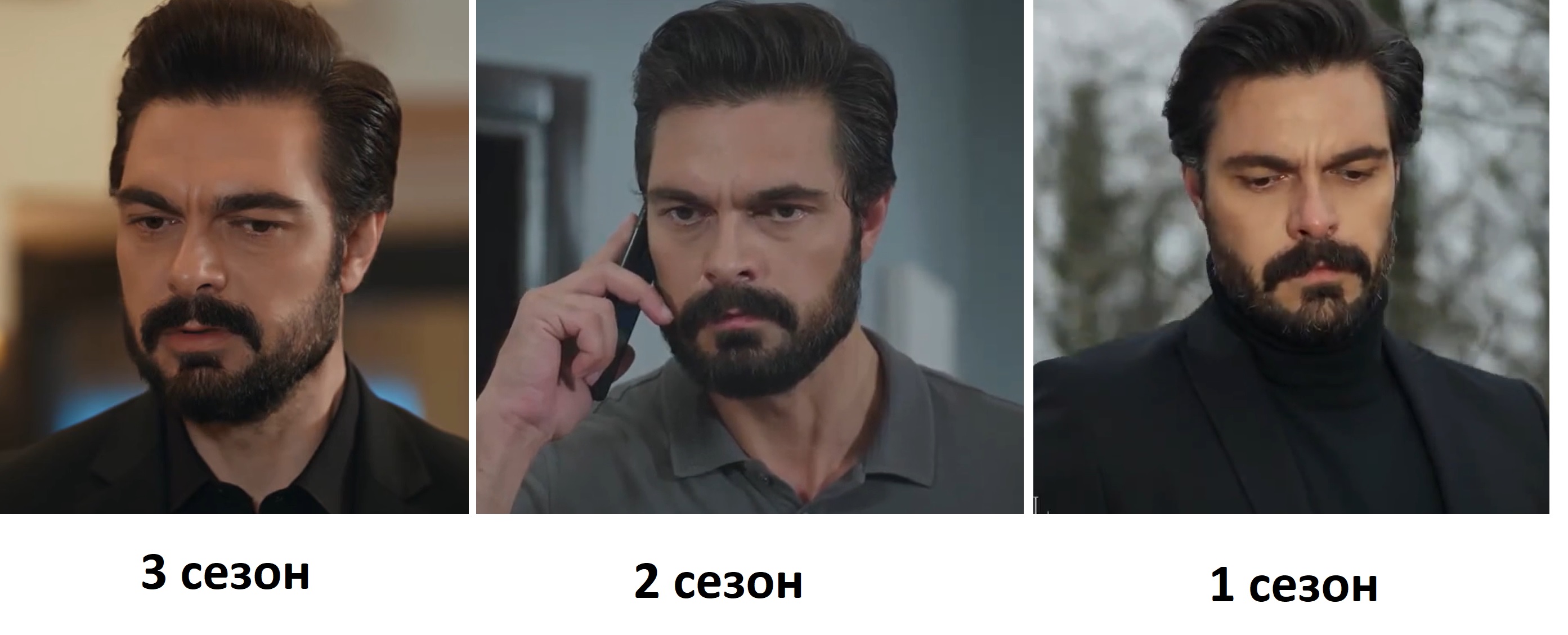 В 1-сезоне красавец из красавцев стойкий, гордый, не доступный.Во 2'--сезоне серьёзен,харизматичен ,привлекатен, Сехер пошла на пользу. В 3-сезоне похудевший,постаревший,не уверенный,нервный от красоты ничего не осталось .Это моё мнение.